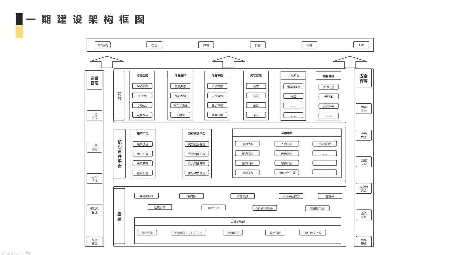 项目系统按照“多元汇聚、融合生产、多屏分发、统一管理、分级共享”的建设思路,结合智能、超高清(4K)等前沿技术,为公司大小屏内容运营、智慧社区、区县分子公司等业务团队提供内容汇聚、制作、审核、分发等内容生产全流程服务能力。同时,为区县融媒体、政企行业等合作方以多租户形式,提供融媒体生产能力,实现各方面内容的互联互通、资源共享、协同互动,共同构建良好的融合媒体生态格局。