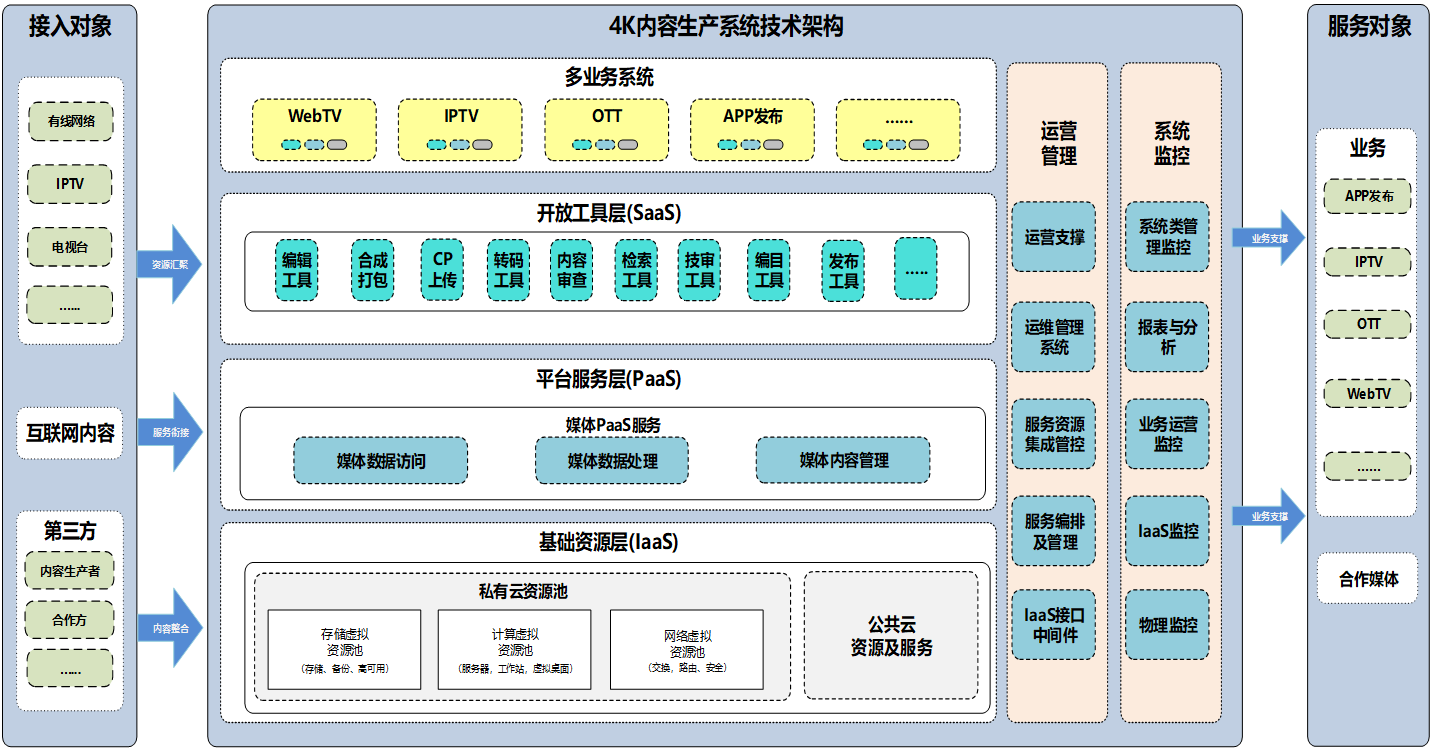 1、构建4K内容生产系统,实现4K内容生产系统基本管理,对外提供标清、高清、超高清的云非编、云转码、云渲染等云服务能力;