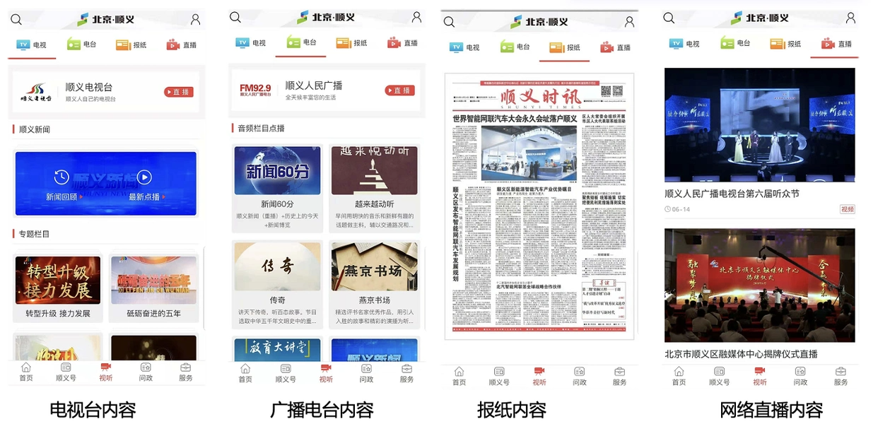 1、构建了面向北京顺义的综合性移动客户端,在APP客户端中实现了电视、广播、报纸、网络直播内容的融合发布,实现了县级委办厅局、村镇信息发布,实现了县内企业、个人“融媒号”内容发布,实现了内容向微博、微信、头条、抖音同步发送,客户端整体具备了开展“政务、民生、新媒体活动”综合信息服务的能力;