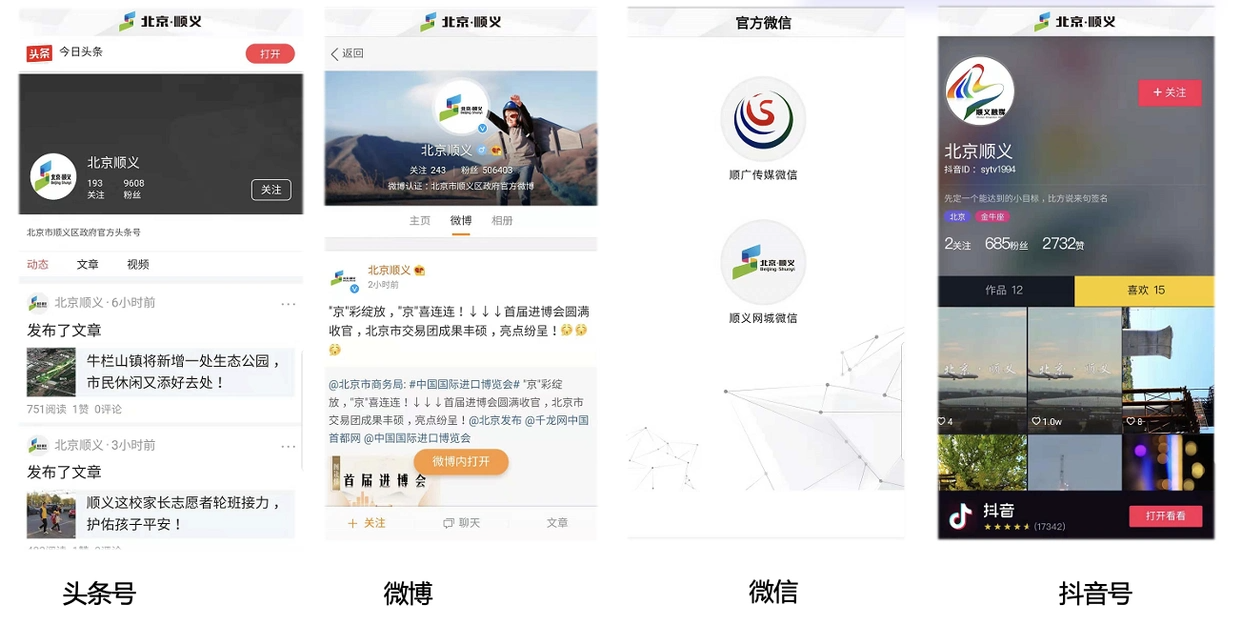 3、构建了顺义抖音号、顺义官方微博号、顺义官方微信号、顺义官方头条号等面向新媒体的媒体号矩阵,并将其连接到融媒体发布平台中,同时将其内容统一整合到APP新闻客户端。