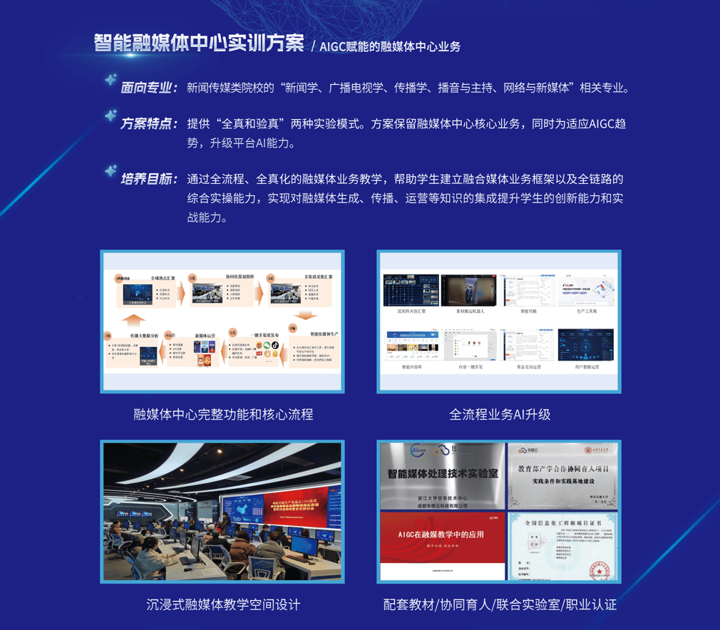 方案分为AIGC智能创意工场和智能融媒中心实训方案,前者侧重AIGC工具及能力的专项培养,后者侧重于融合媒体完整业务流程的实操技能培养,致力于打造与产业人才发展相匹配的课程体系、实践平台、教学服务,确保学生所学技能与产业需求同频共振。