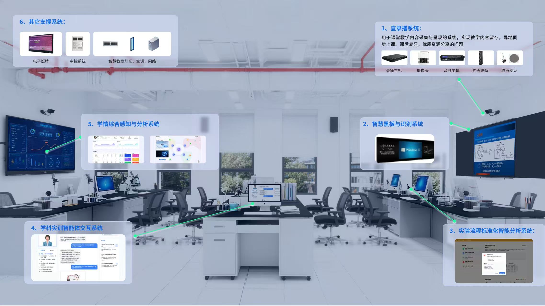 通过软硬系统一体设计,基于数智互联技术打破教室空间边界,实现物理空间、数字平台、教学资源、教学评管数据的全域贯通,构建无边界的沉浸式学习环境。